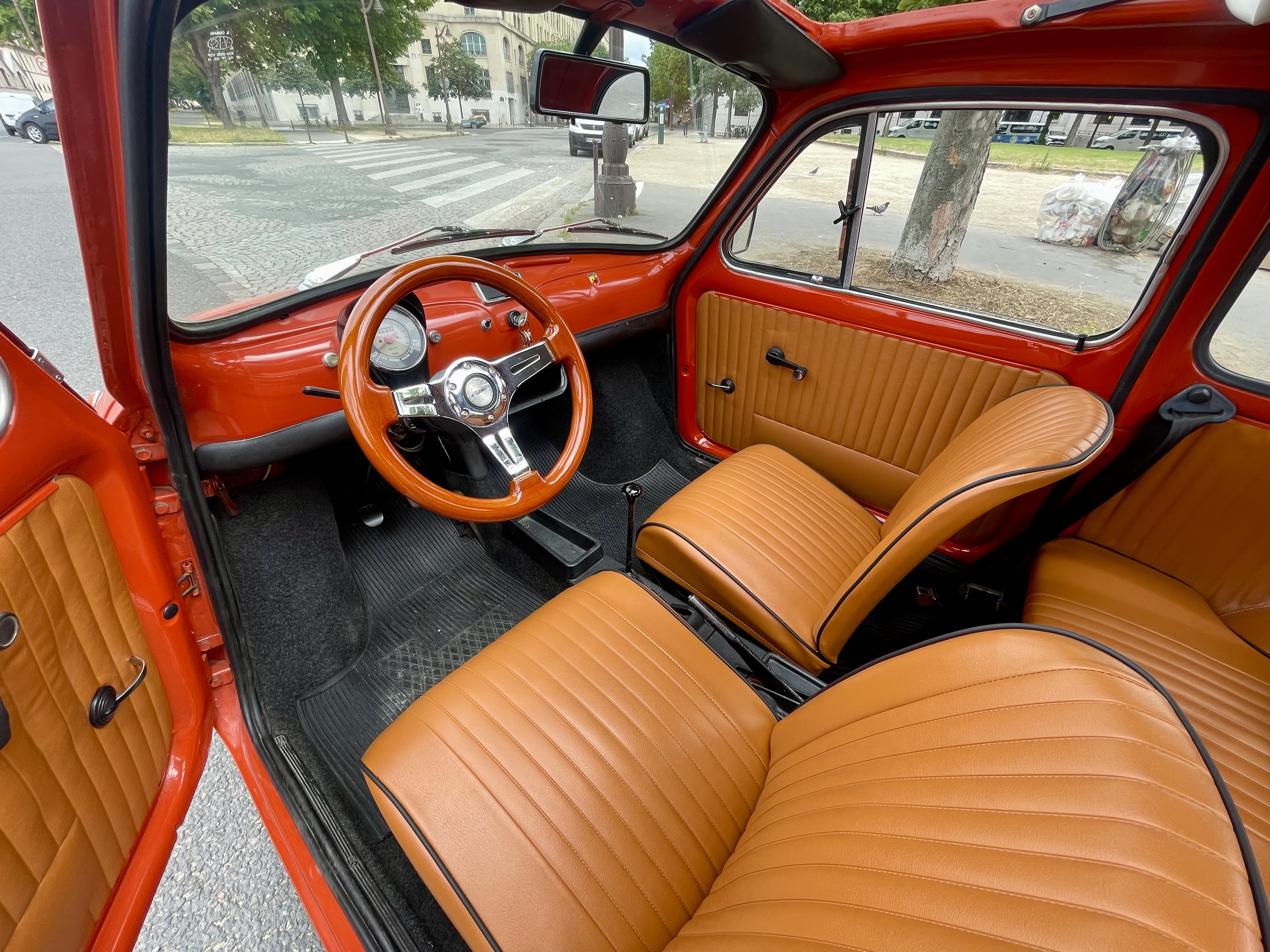 Elle a également sont petit compteur rond d’origine et son tableau de bord peint couleur carrosserie, c’est le modèle le plus recherché de Fiat 500.